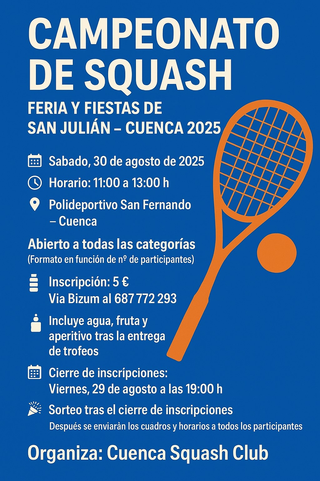 ¡Ya es oficial! El Cuenca Squash Club acogerá el próximo Campeonato de España de Veteranos de Squash 57. Será entre el 18 y 19 de julio, en las instalaciones del Polideportivo San Fernando. La inscripción se podrá realizar próximamente en Rankedin, con un coste de 25€/participante. La fecha máxima de inscripción es el 9 de […]