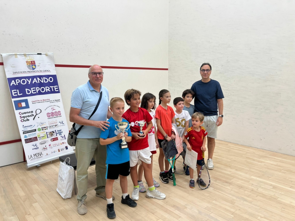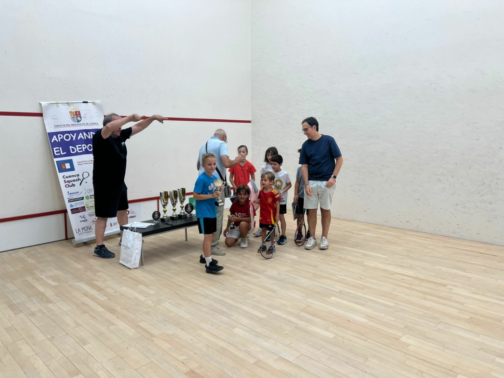 Por su parte, la categoría infantil resultó especialmente emotiva. Niños y niñas de entre cinco y doce años participaron con entusiasmo, demostrando que el squash tiene un futuro prometedor en la provincia. Entre los nombres destacados se encontraban Neil, procedente de Socuéllamos, y jóvenes conquenses como Valentina, Manuel, los hermanos Sara y Pablo, así como Alfonso y Miguel.